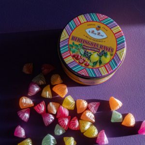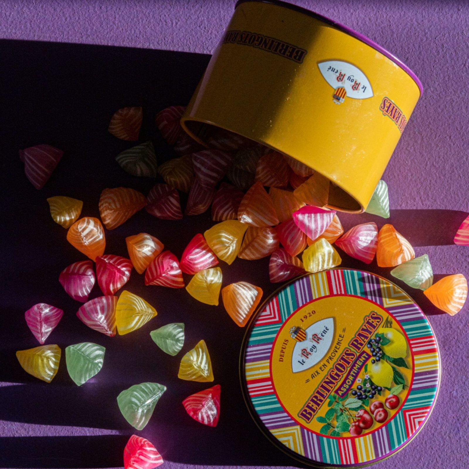 Les berlingots du Roy René, petits bonbons provençaux colorés, allient sucre et arômes naturels dans une recette transmise depuis des générations. Un assortiment gourmand de cinq saveurs : framboise, citron, orange, anis et cerise, pour un doux voyage aux saveurs d’enfance.