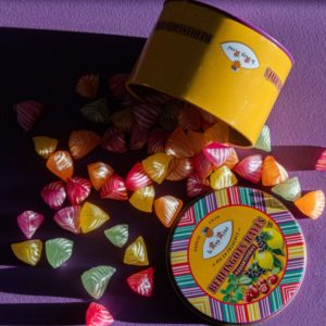 Ingrédients : Sucre (FRANCE), sirop de glucose, arômes naturels, denrée colorante alimentaire (concentrés de spiruline, carthame, carotte, patate douce, citron), anéthol (Sulfites), acidifiant, acide citrique.