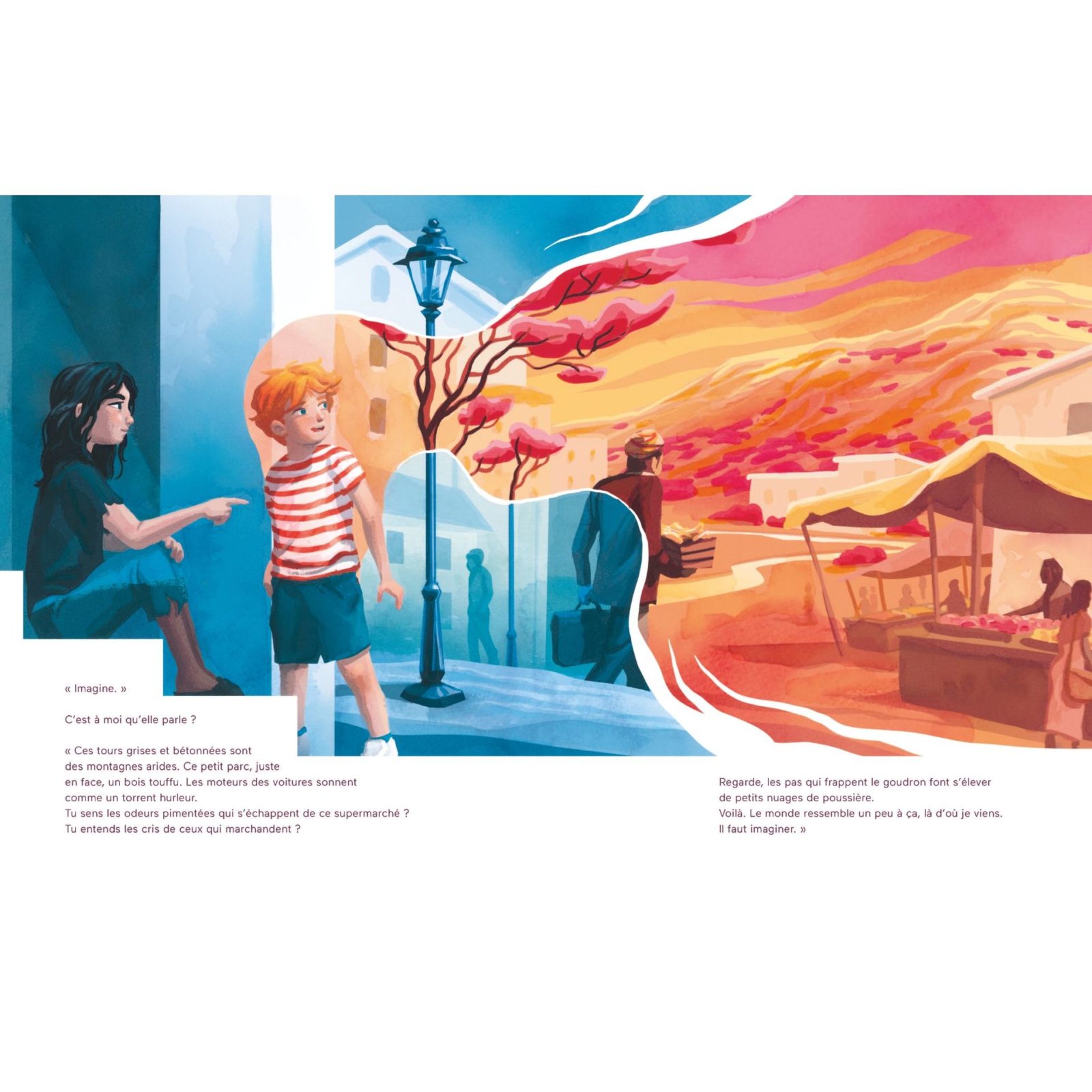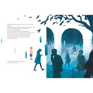 « Ce matin, sous les arcades de la place, il y a une fille à écouter. Elle raconte aux pigeons. Aux platanes. Aux passants pressés. Quelques sons envolés, quelques mots murmurés qui effleurent mes oreilles. Qui bousculent mon ennui. C’est à moi qu’elle parle ? » Elle, l’adolescente venue de loin, se remémore et se confie. Lui, le petit garçon d’ici, l’écoute et s’interroge. Tout les sépare, pourtant une nouvelle amitié se crée. Les sourires échangés suffiront-ils à faire rejaillir l’espoir ?