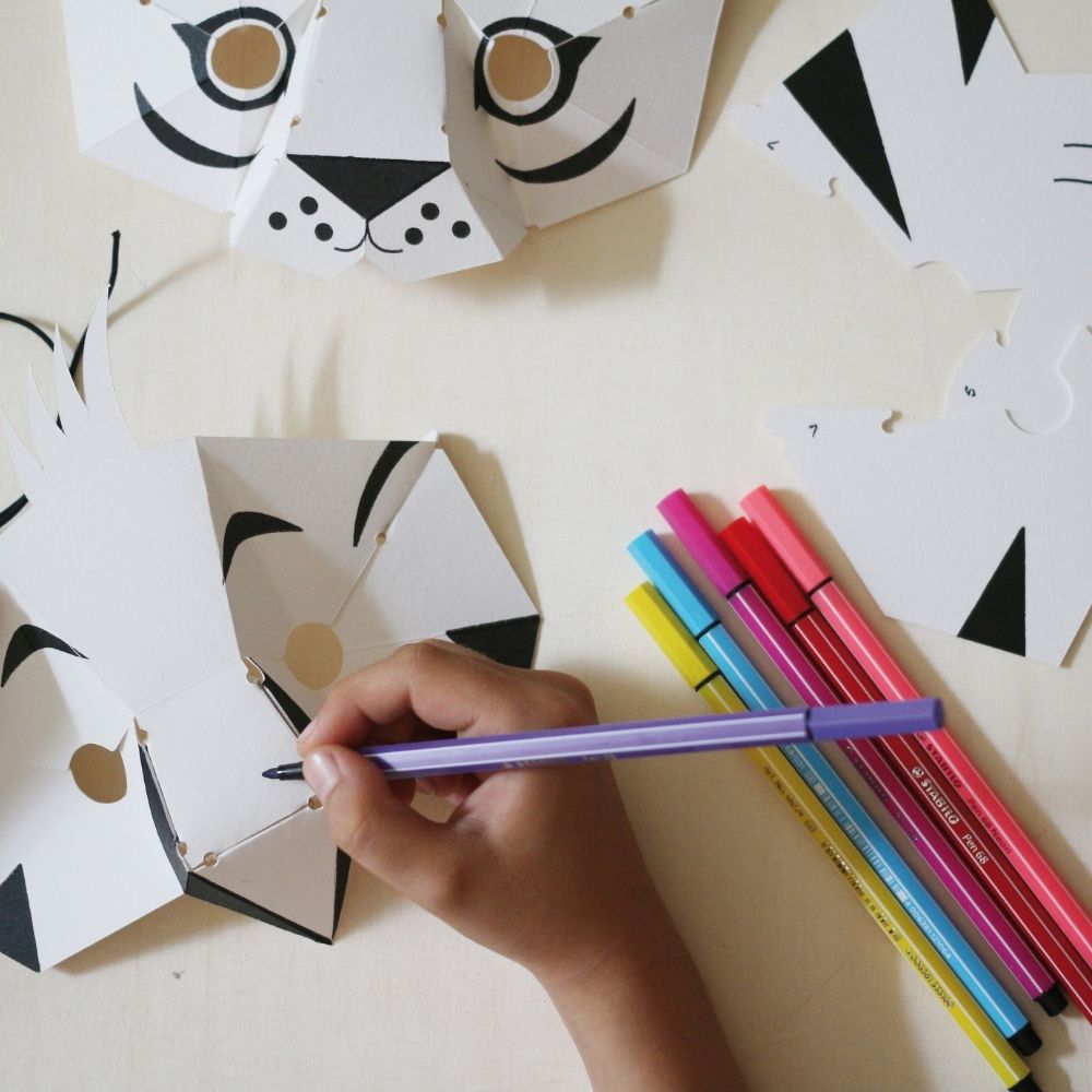 Chaque masque prend forme en assemblant le papier grâce à des élastiques (système breveté Elastiblock®). Ils sont ensuite prêts à être colorés selon son imagination !