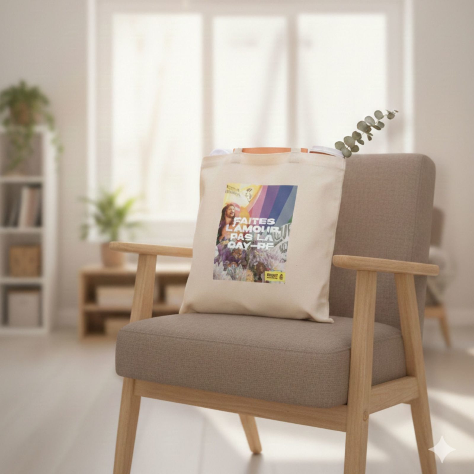 Avec son message percutant « Faites l’amour, pas la gay-re », ce visuel détourne les codes pour défendre l’amour, l’égalité et le droit d’exister sans haine. Un totebag durable, en coton recyclé et fabriqué au Portugal, qui incarne la fierté, la solidarité et l’importance de rester mobilisé·es.